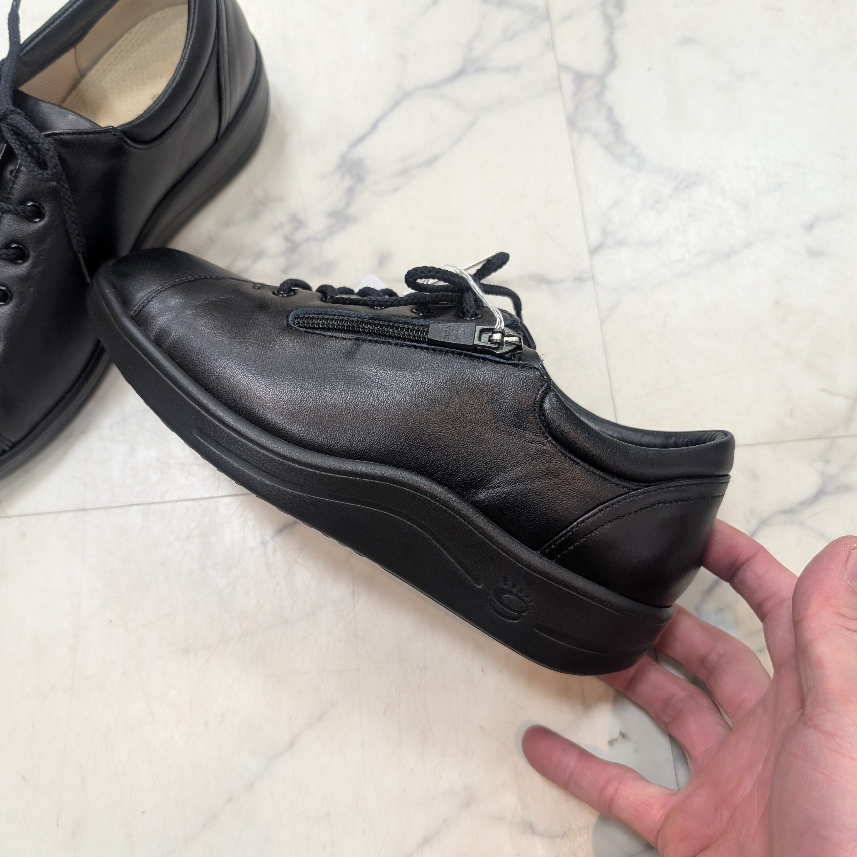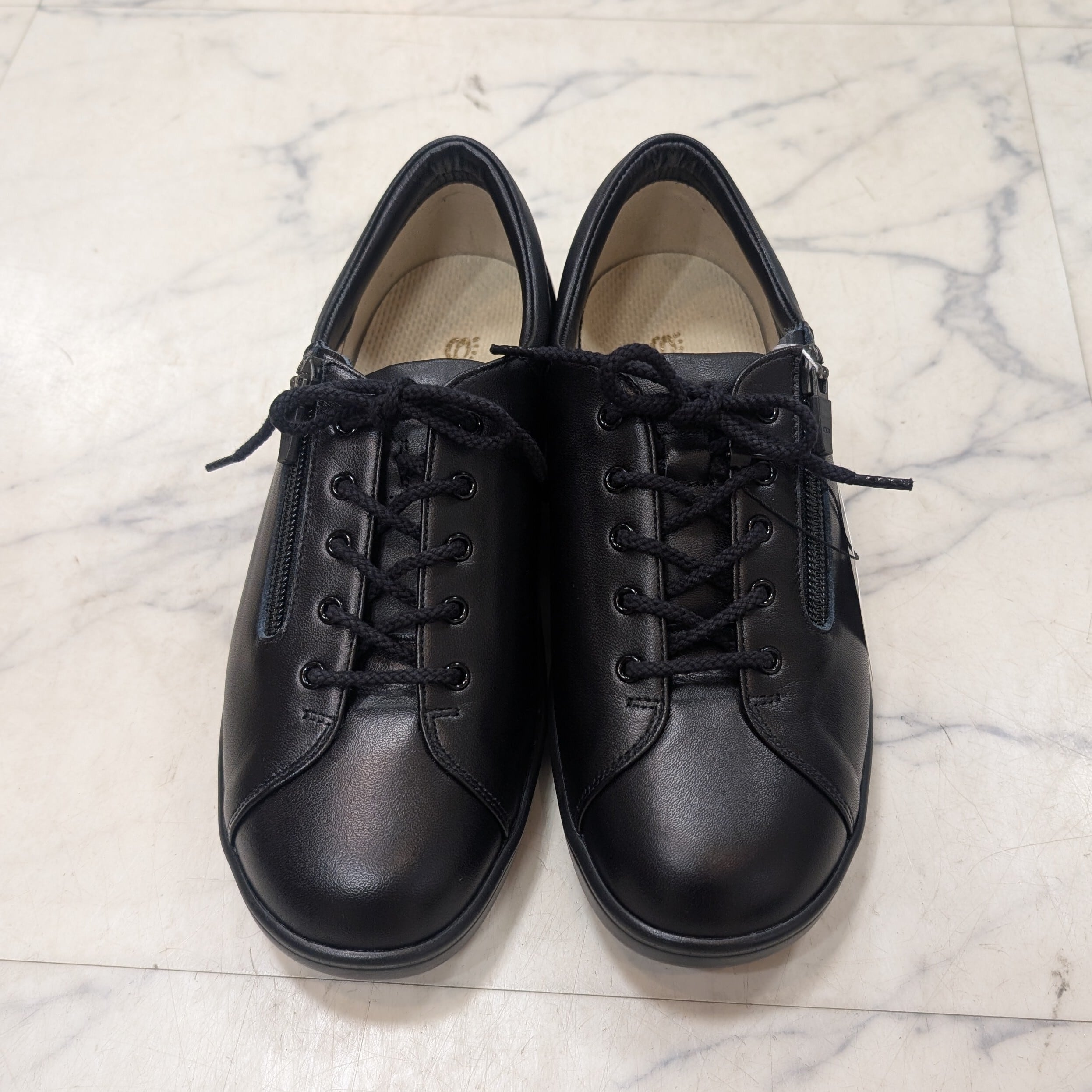 ご用意した外羽根式の紐靴は、甲をしっかり止められるので、どんな足にもフィットします。脱ぎ履きに便利サイドファスナーで紐を締めずしっかり絞めて履いてください。外反母趾、内反母趾など、骨に当たる位置にステッチなどがにシンプルなデザインです。