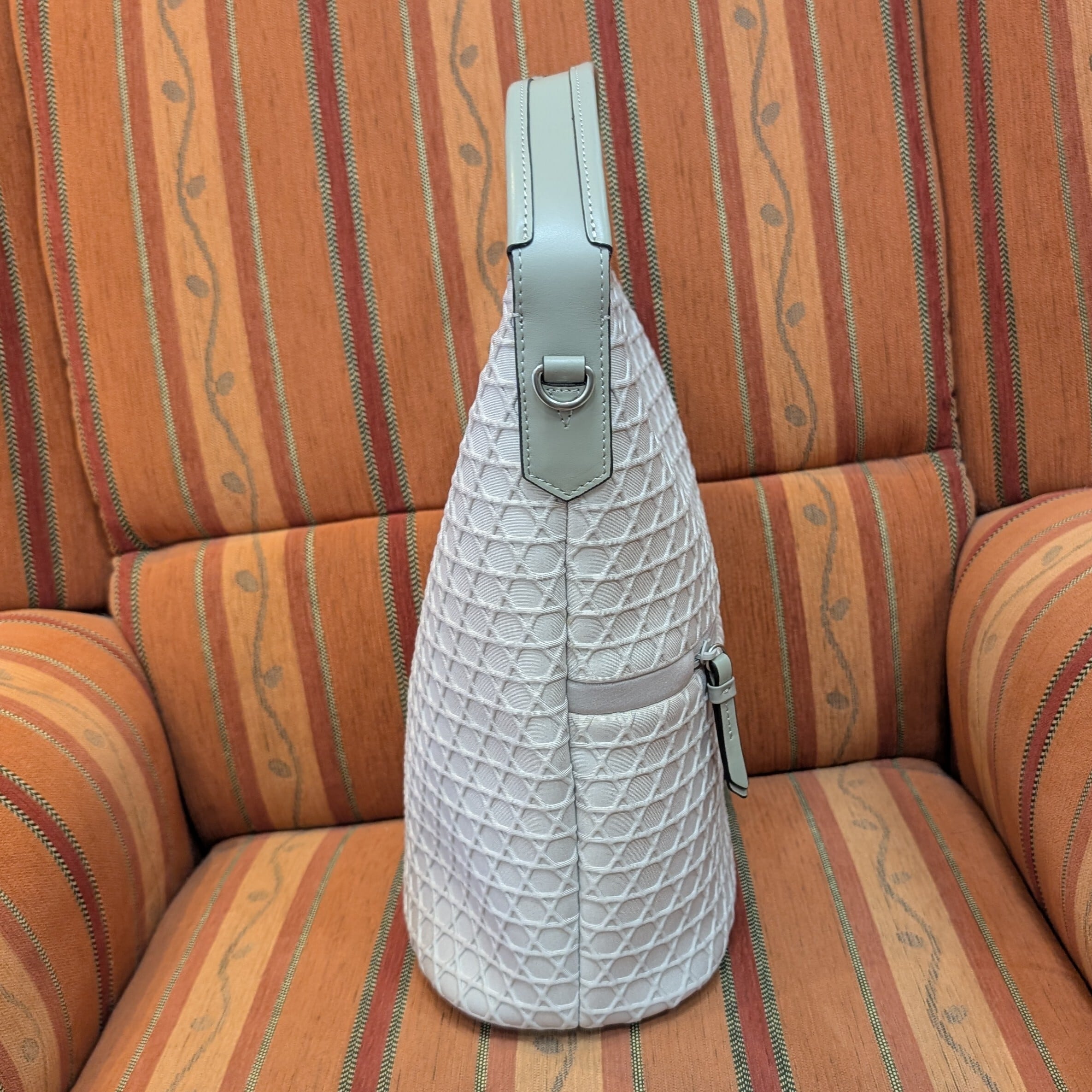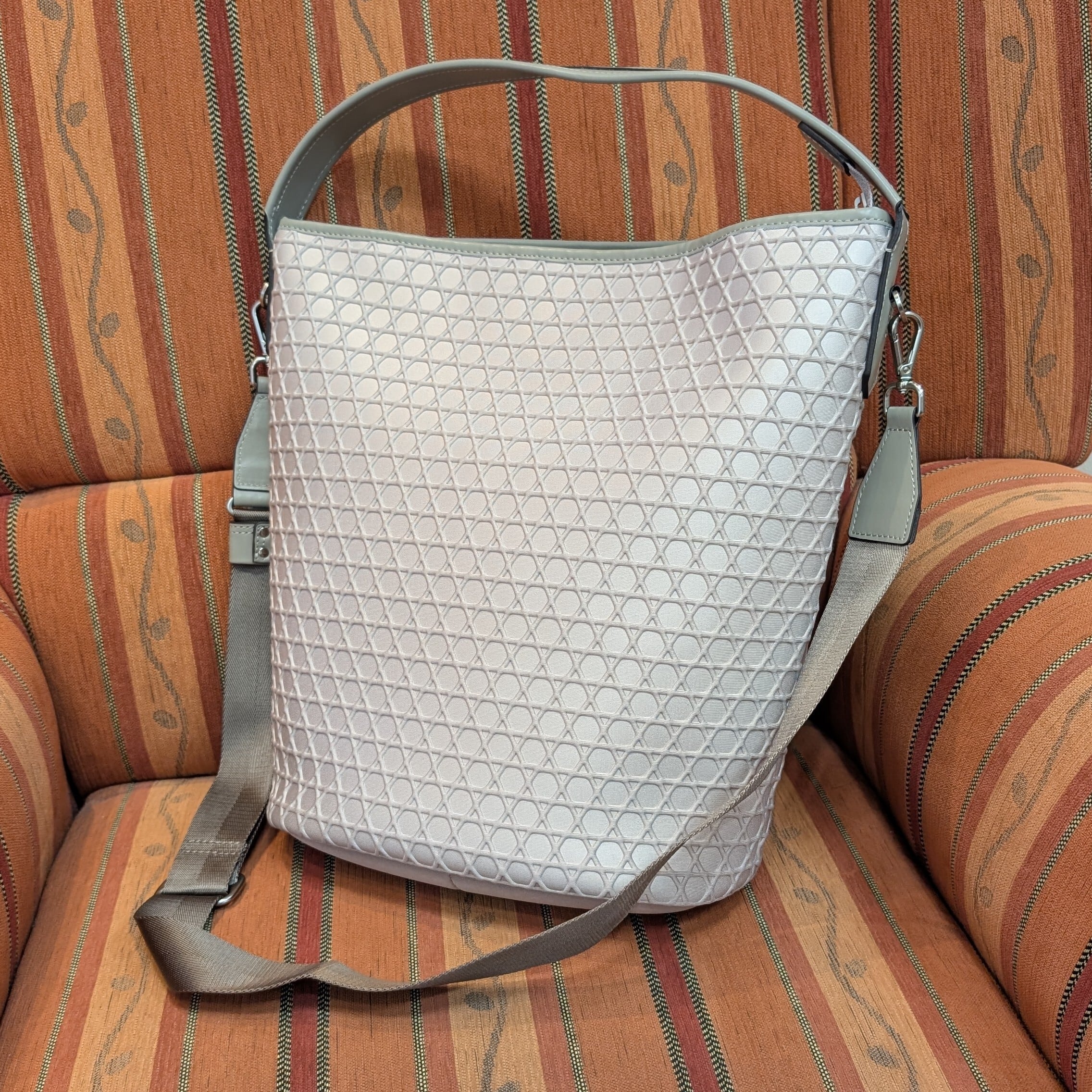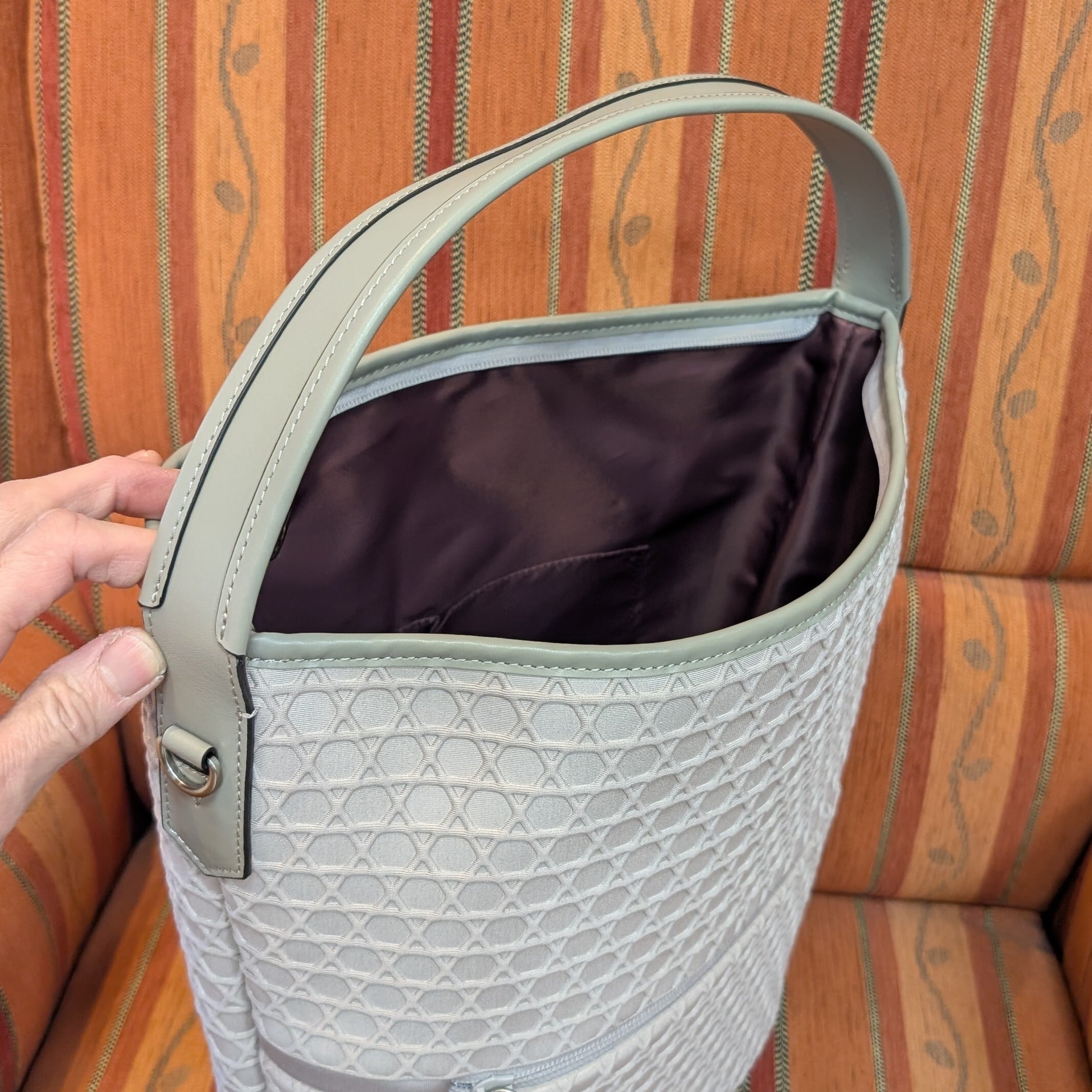 付属のストラップは、短めのレザーで肩掛けに、ナイロン製で斜め掛けにと、2通りのスタイルを楽しめます。斜め掛け時にはレザーハンドルが立ち上がらず、バッグに沿うよう柔らかく仕立てられているのもポイント。