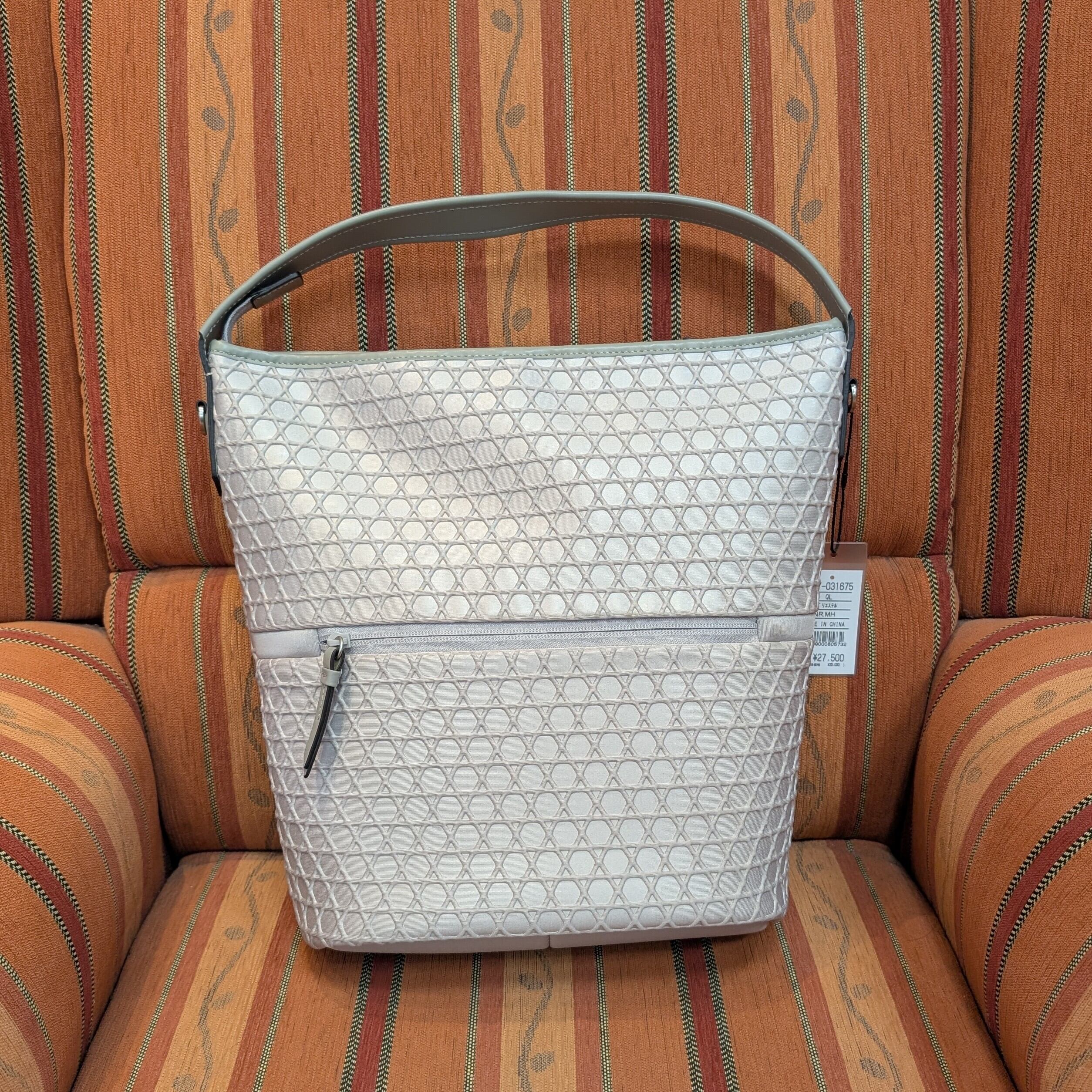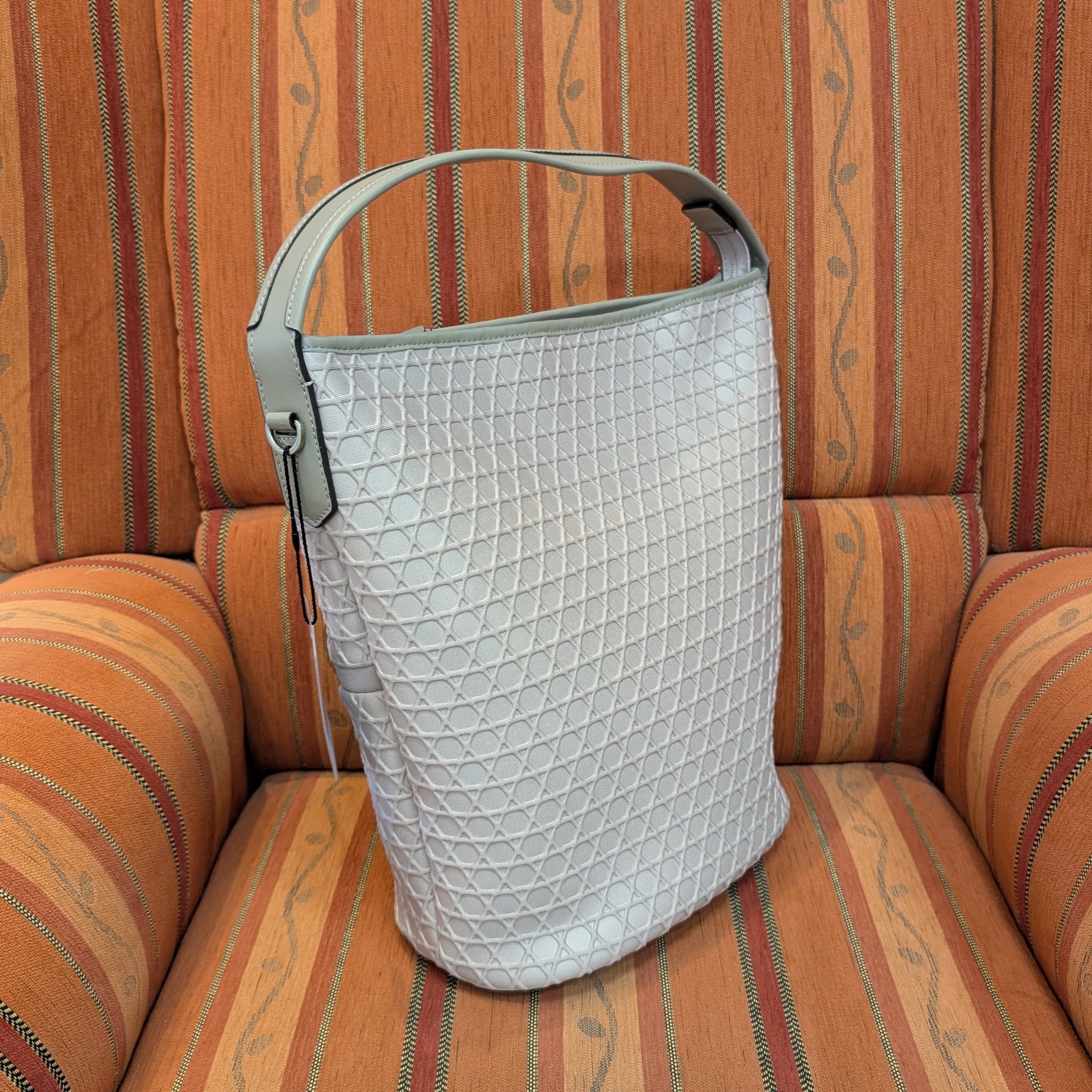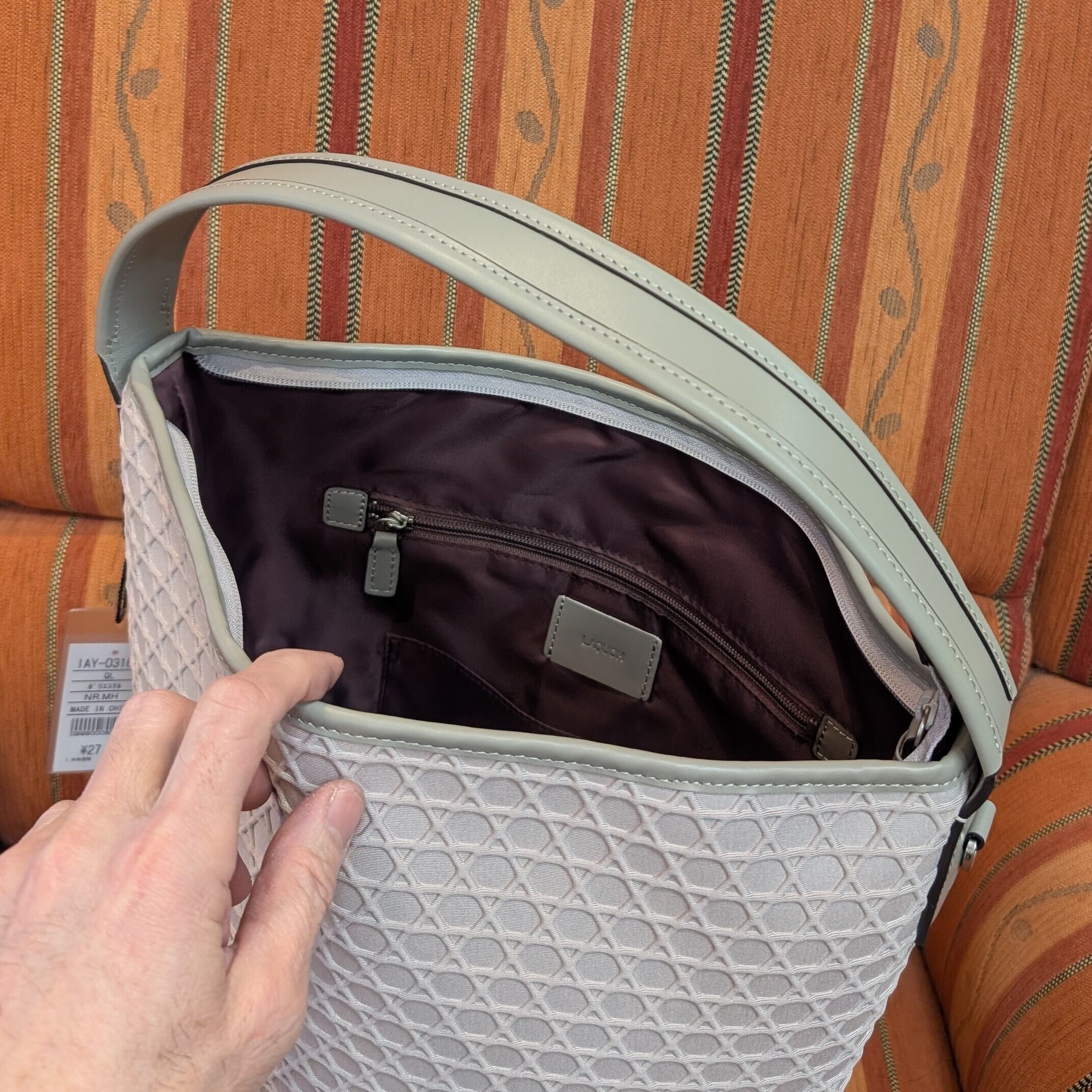 付属のストラップは、短めのレザーで肩掛けに、ナイロン製で斜め掛けにと、2通りのスタイルを楽しめます。斜め掛け時にはレザーハンドルが立ち上がらず、バッグに沿うよう柔らかく仕立てられているのもポイント。