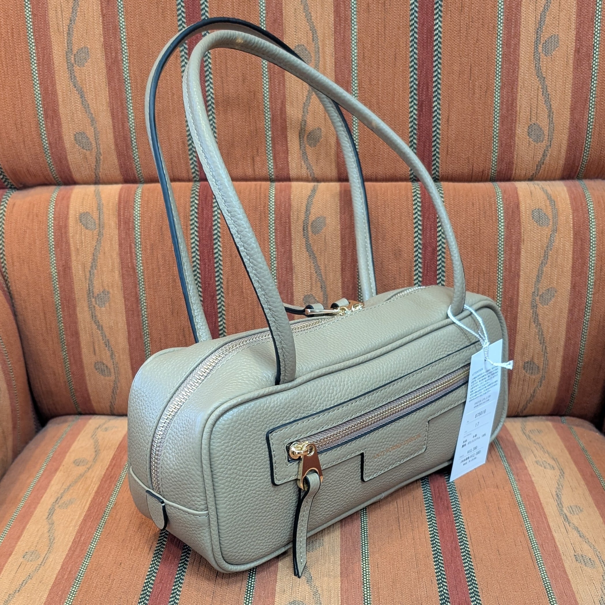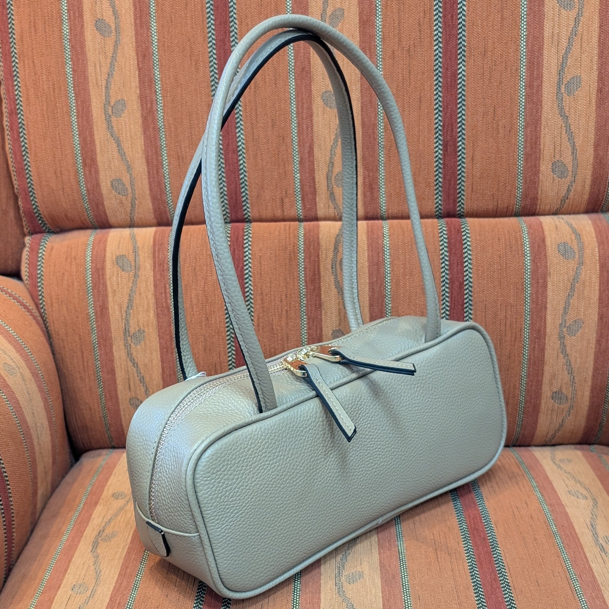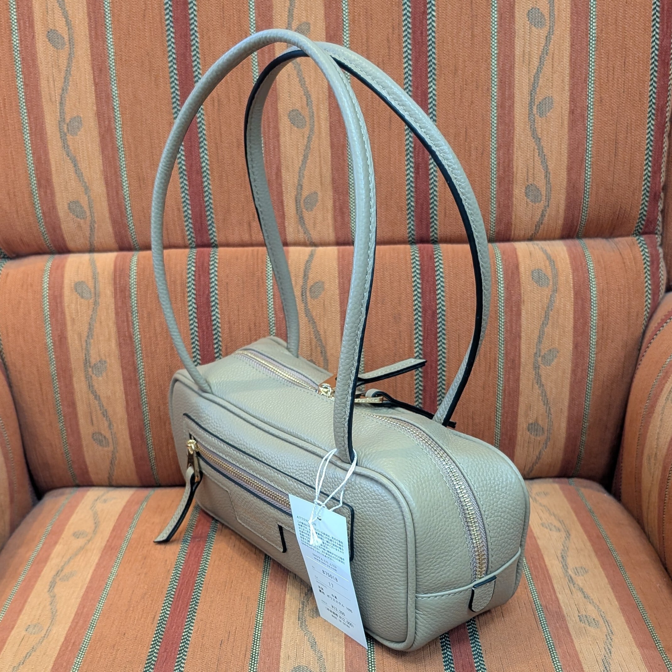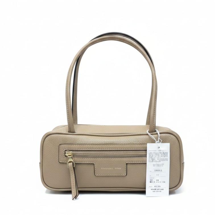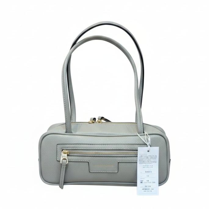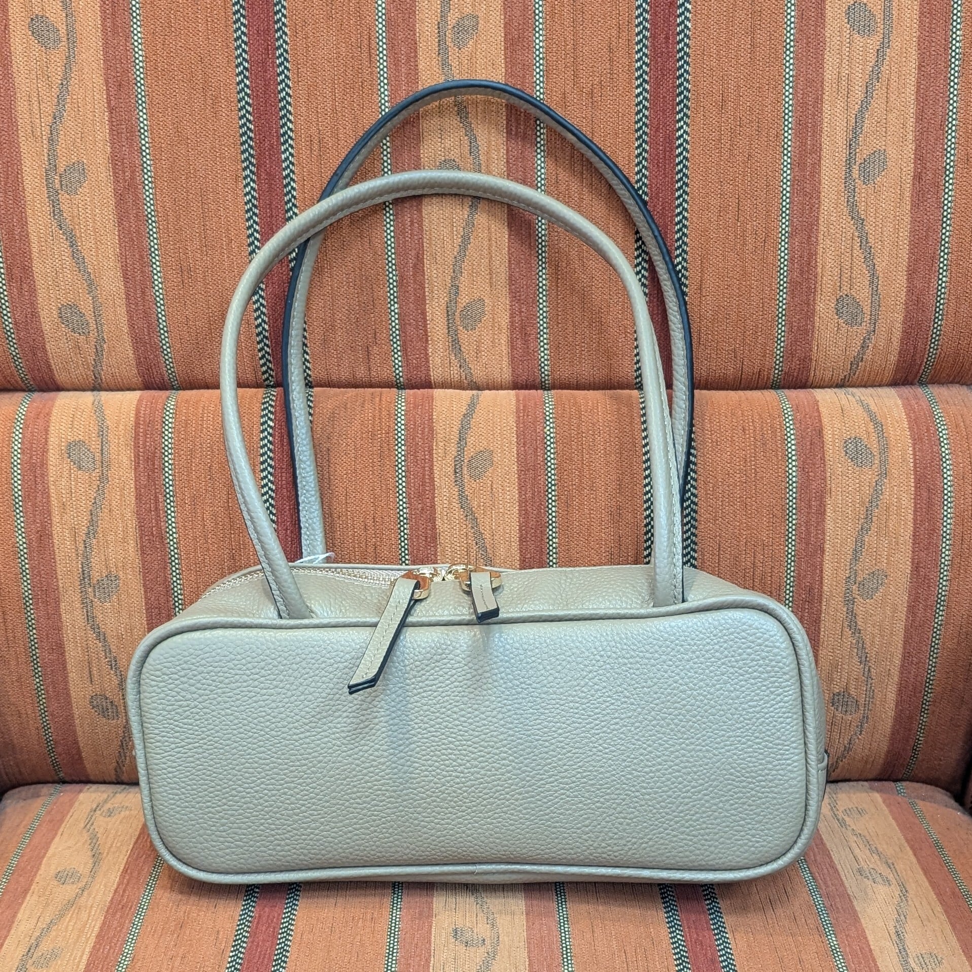 長財布を収納できるミニマムサイズのボストンバッグは、フロントのポケットのゴールドファスナーがデザインのポイントです。