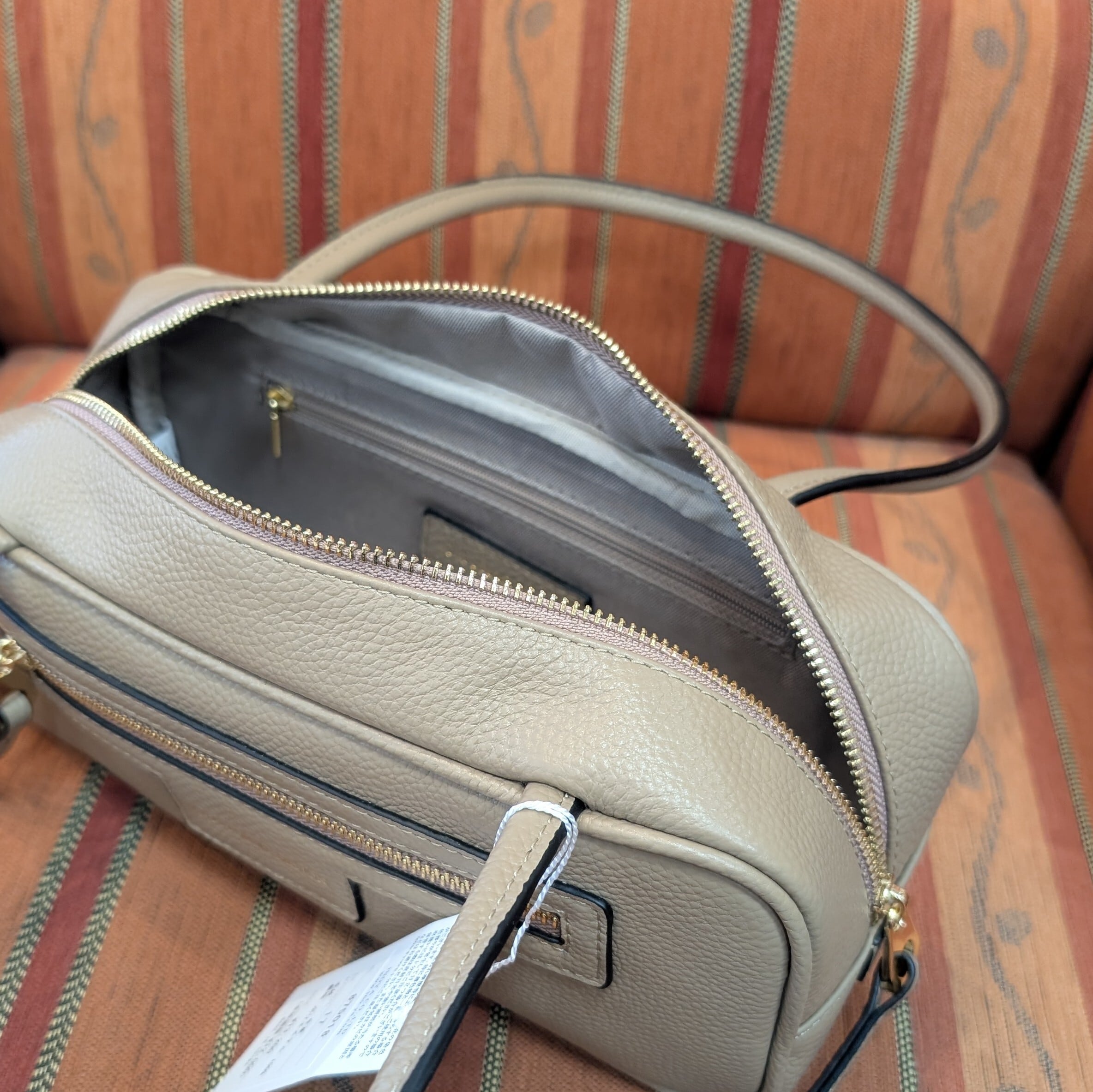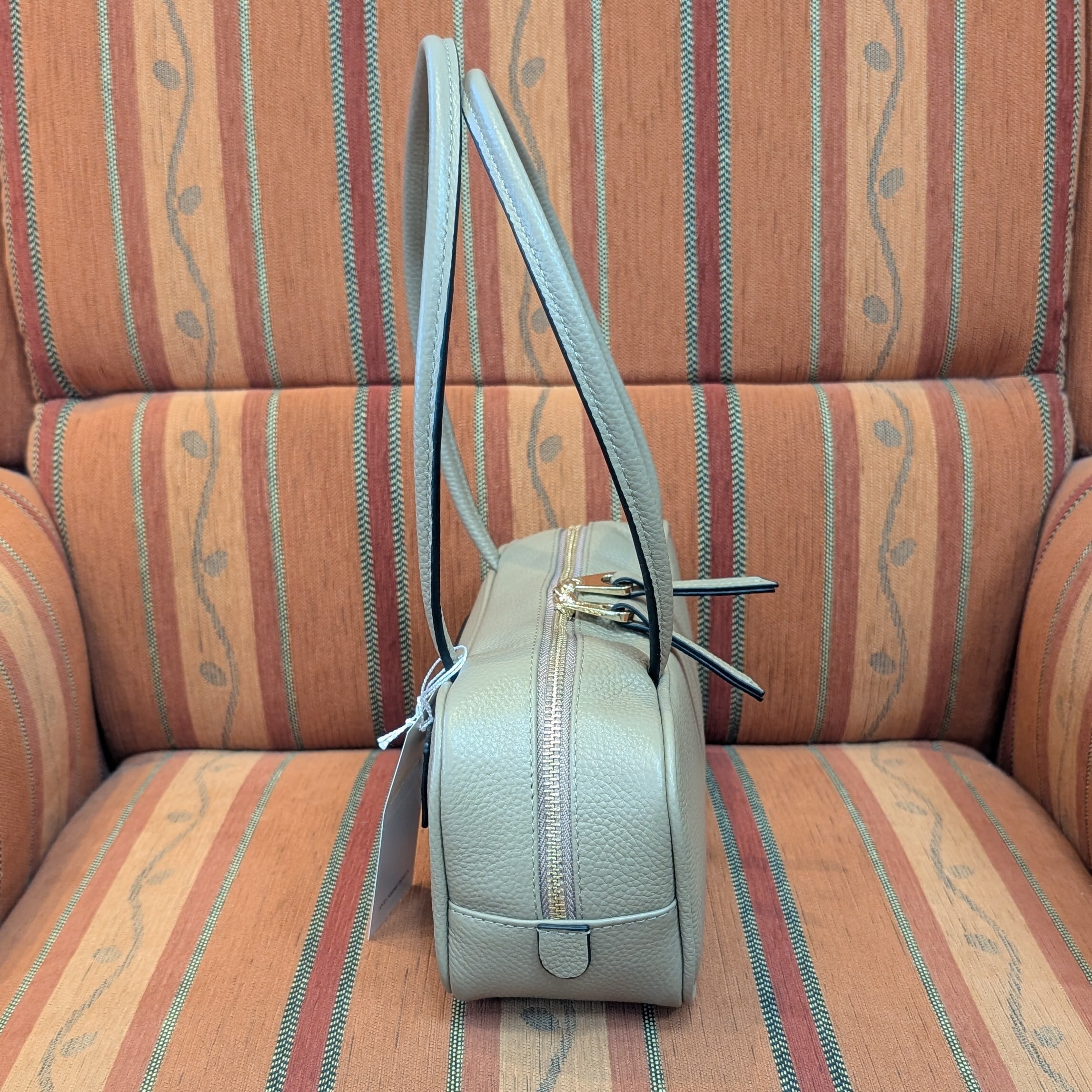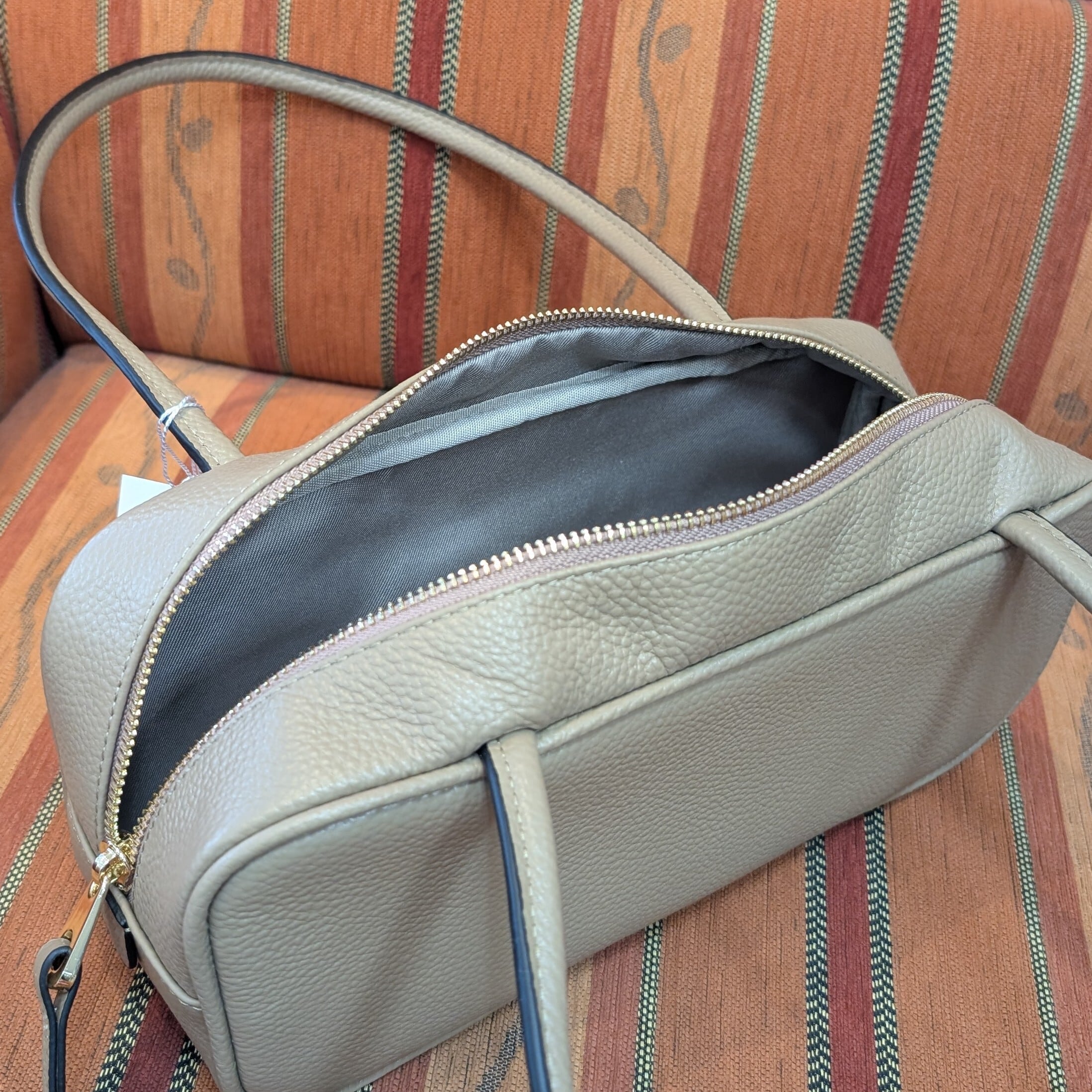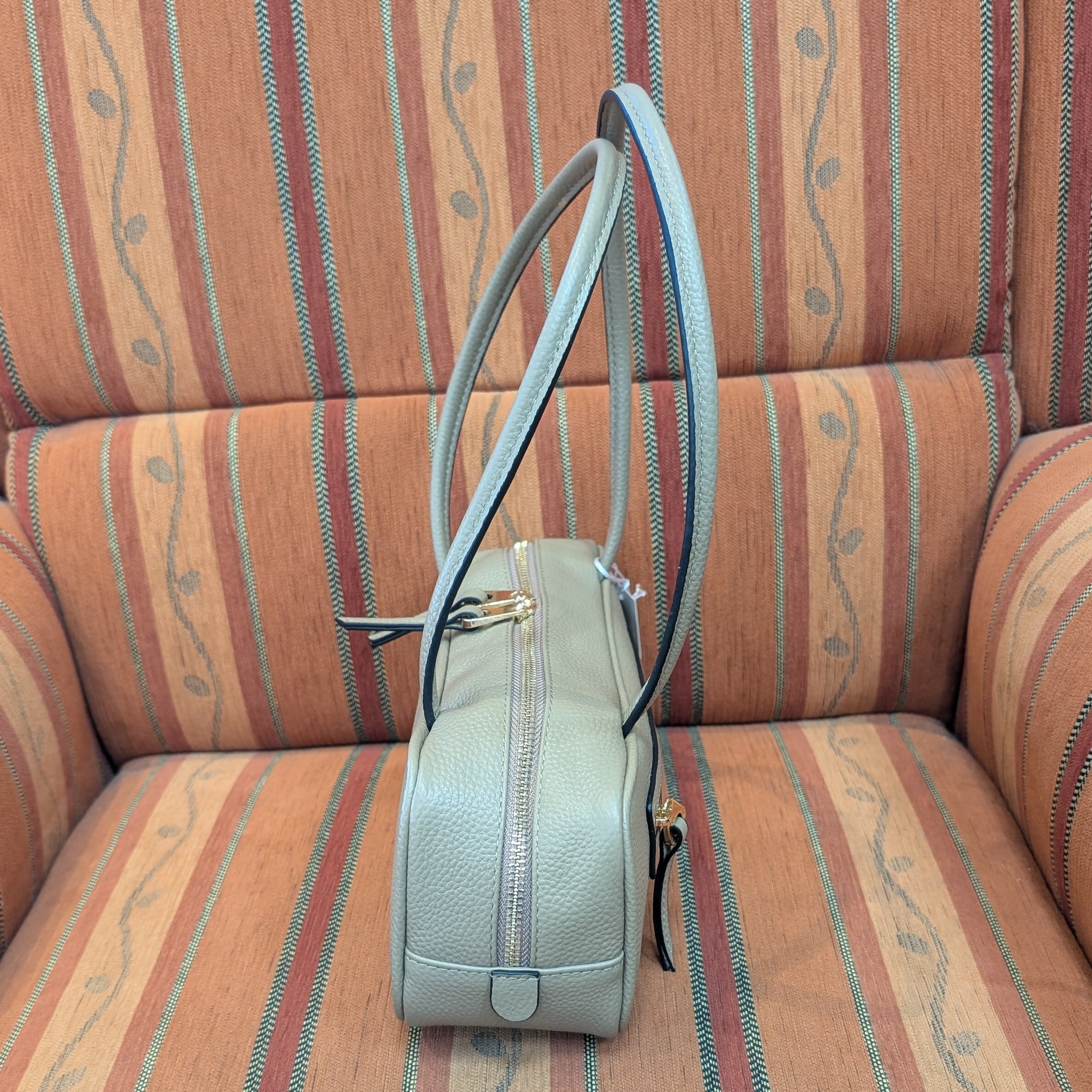 長財布を収納できるミニマムサイズのボストンバッグは、フロントのポケットのゴールドファスナーがデザインのポイントです。