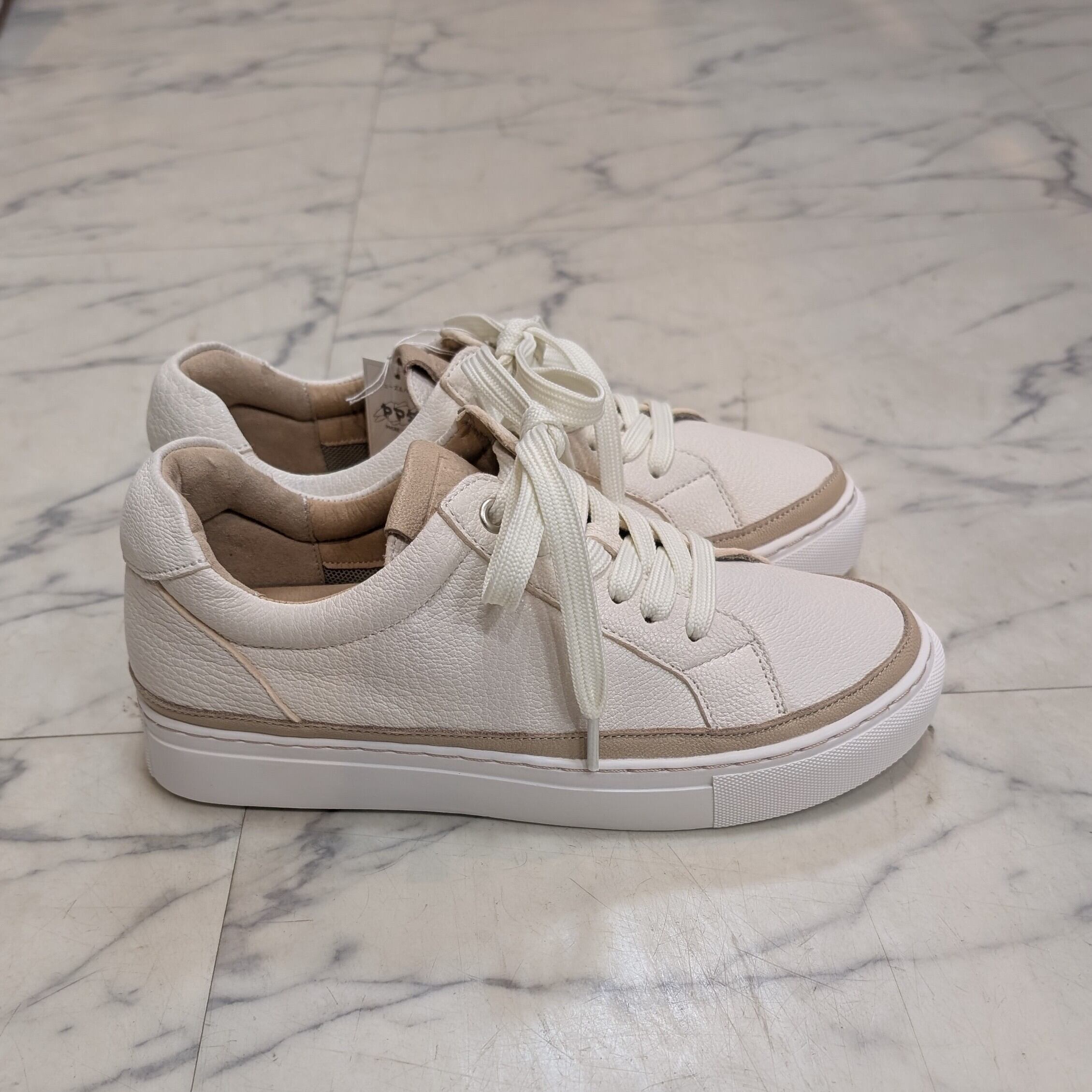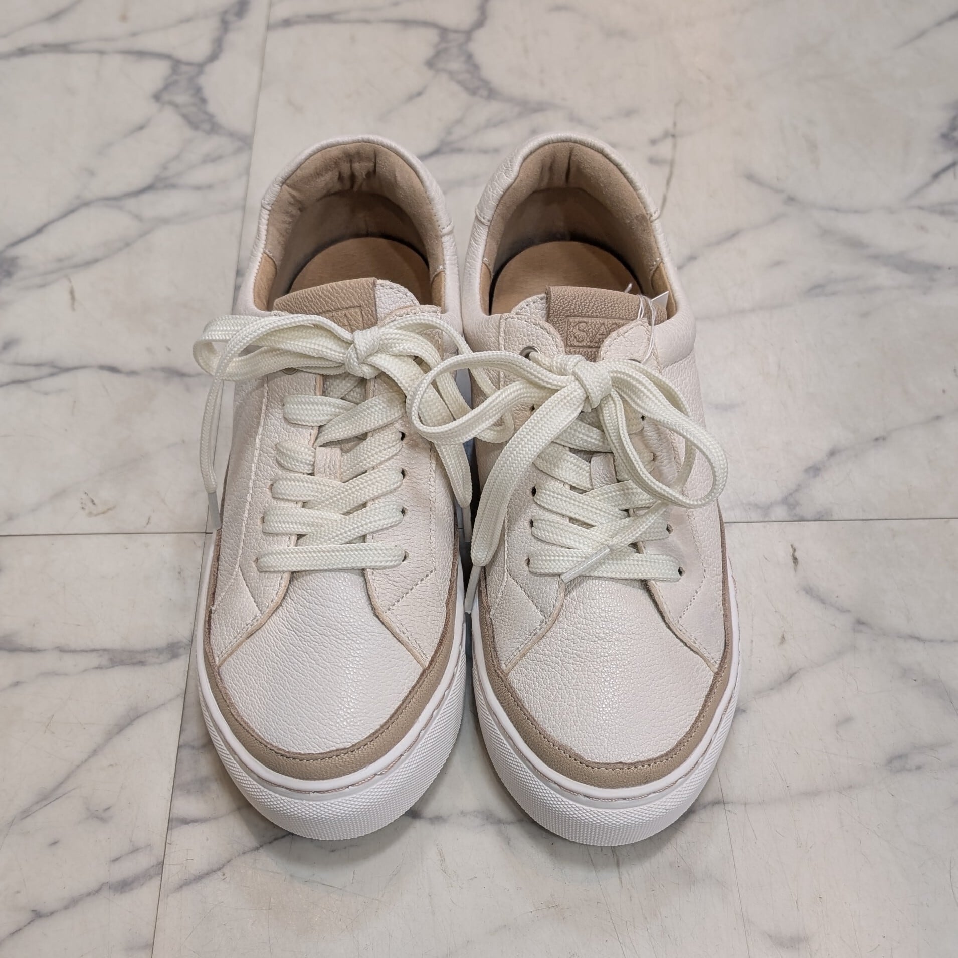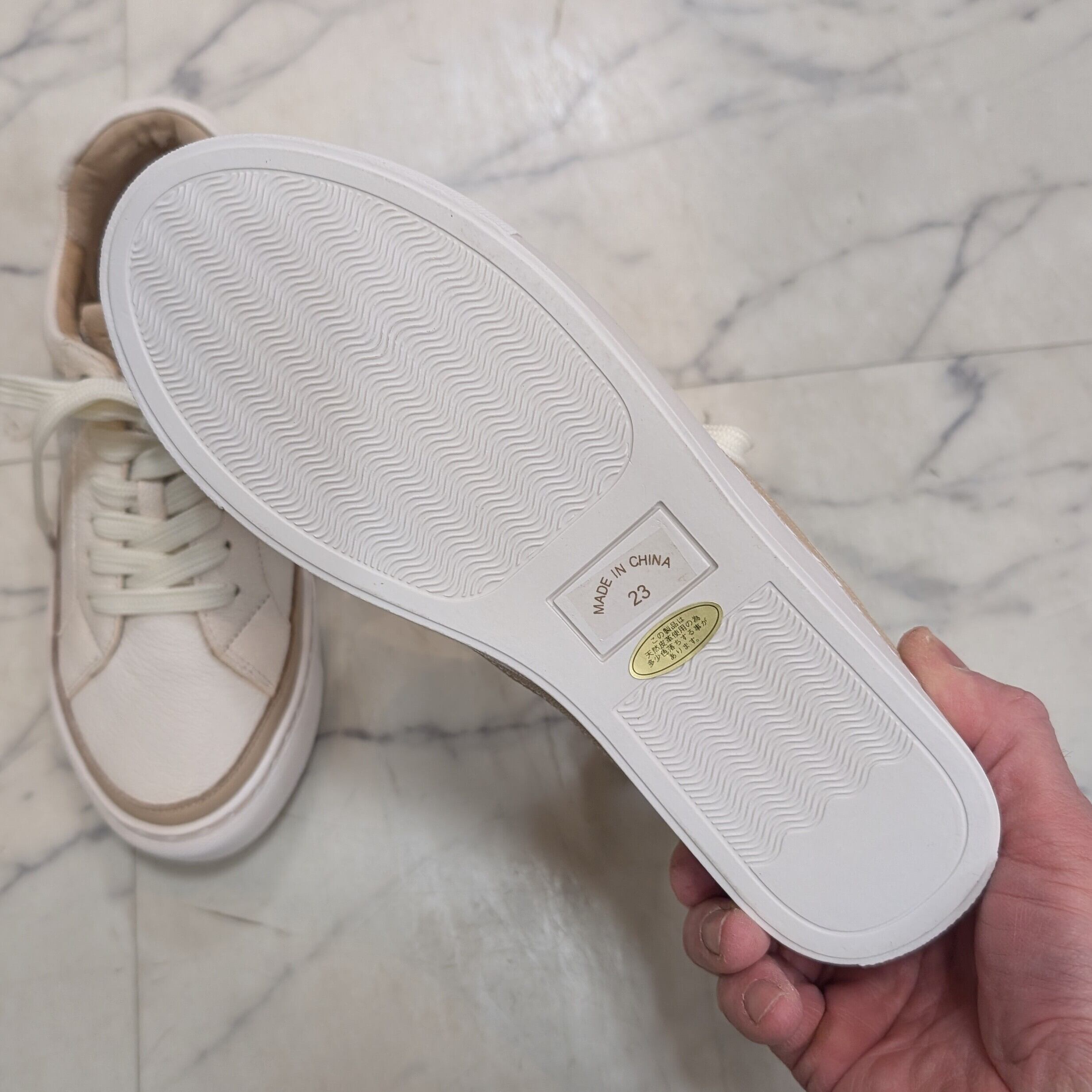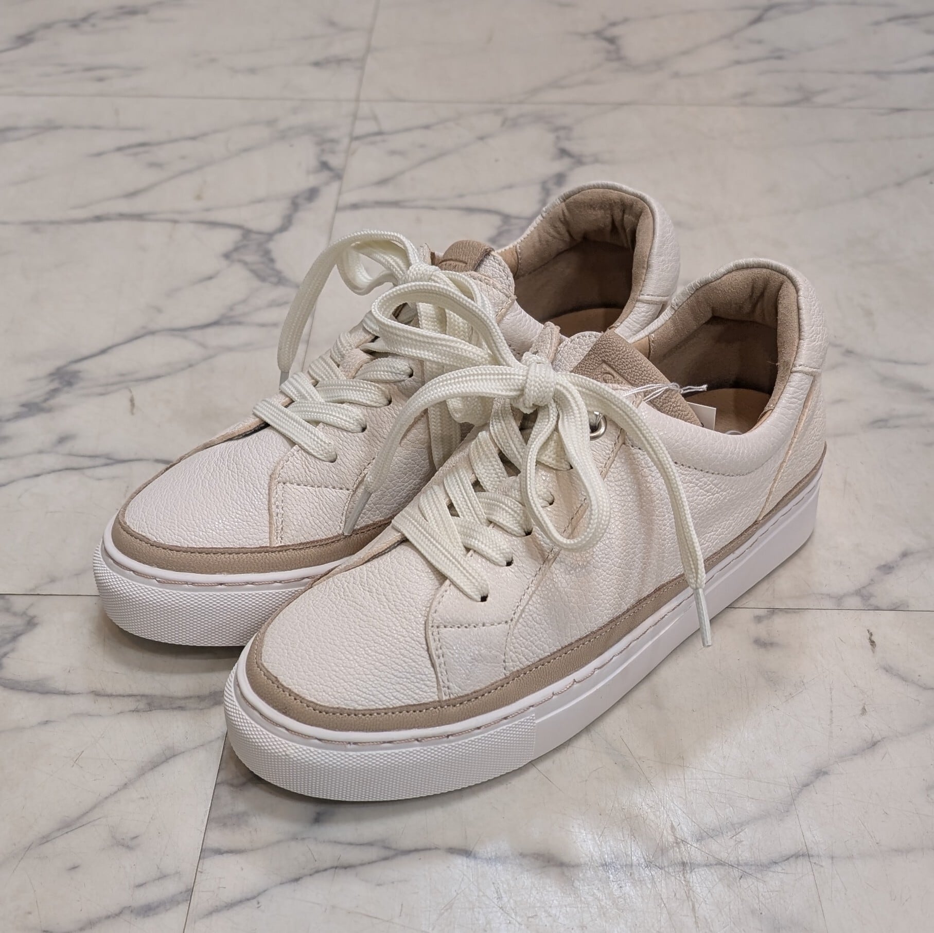 レザーの切りっぱなしとベージュのコバ見せデザインで、程よいナチュラル感がSAYAらしいスニーカー。