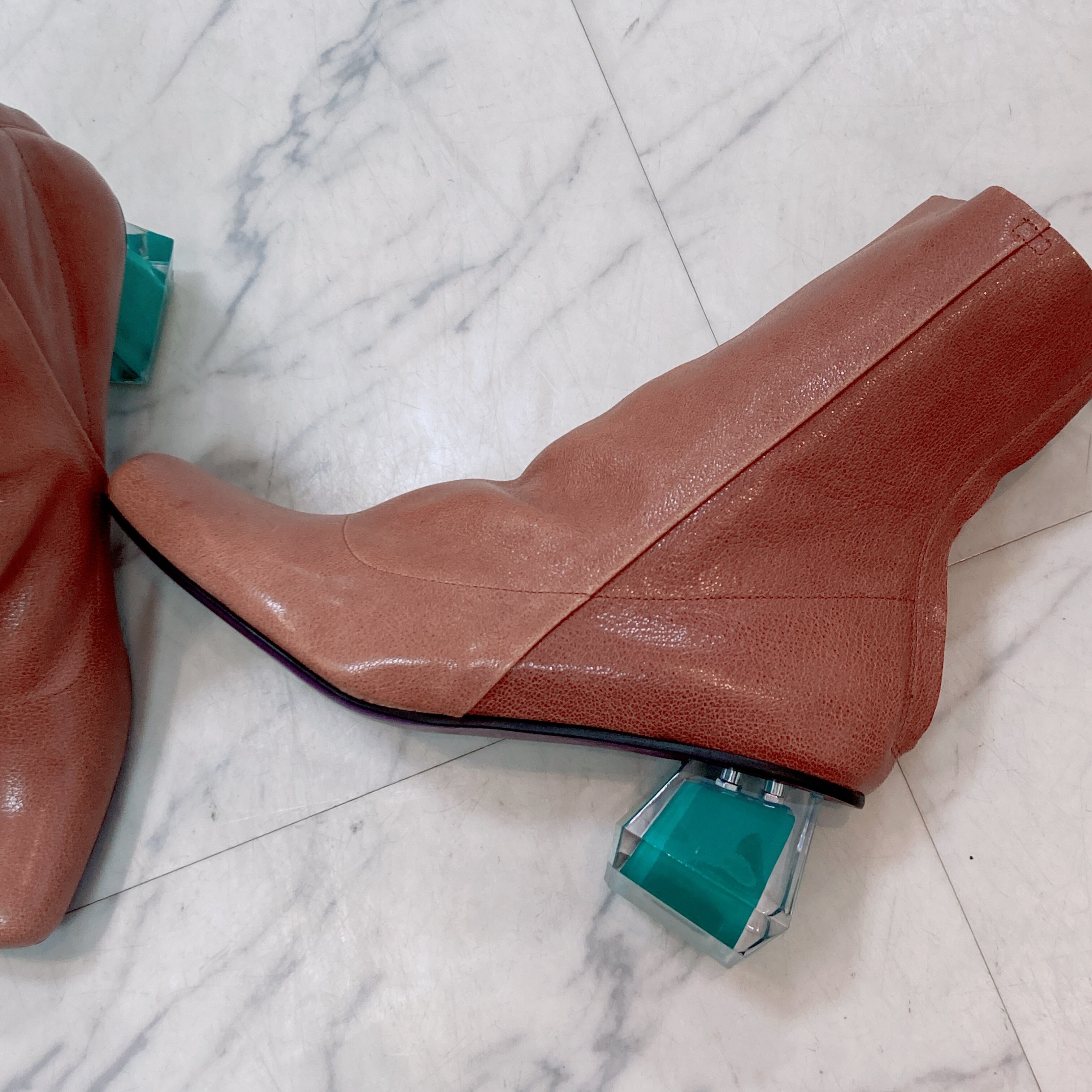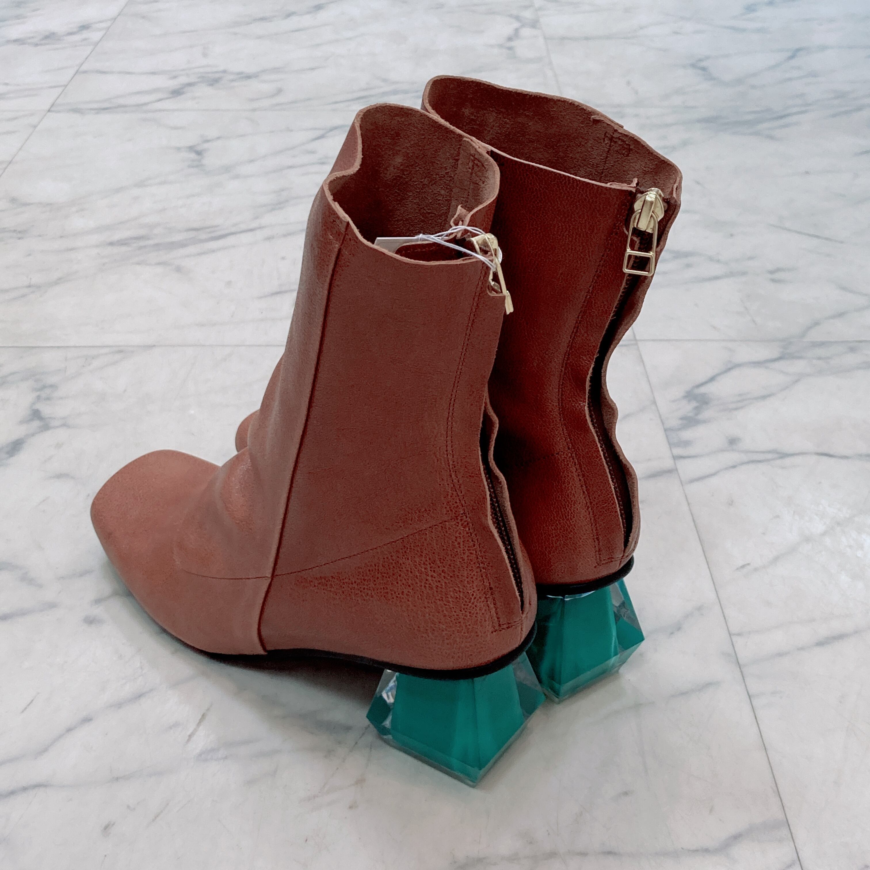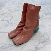 クリスタルヒールがデザインアクセントのハーフブーツです。