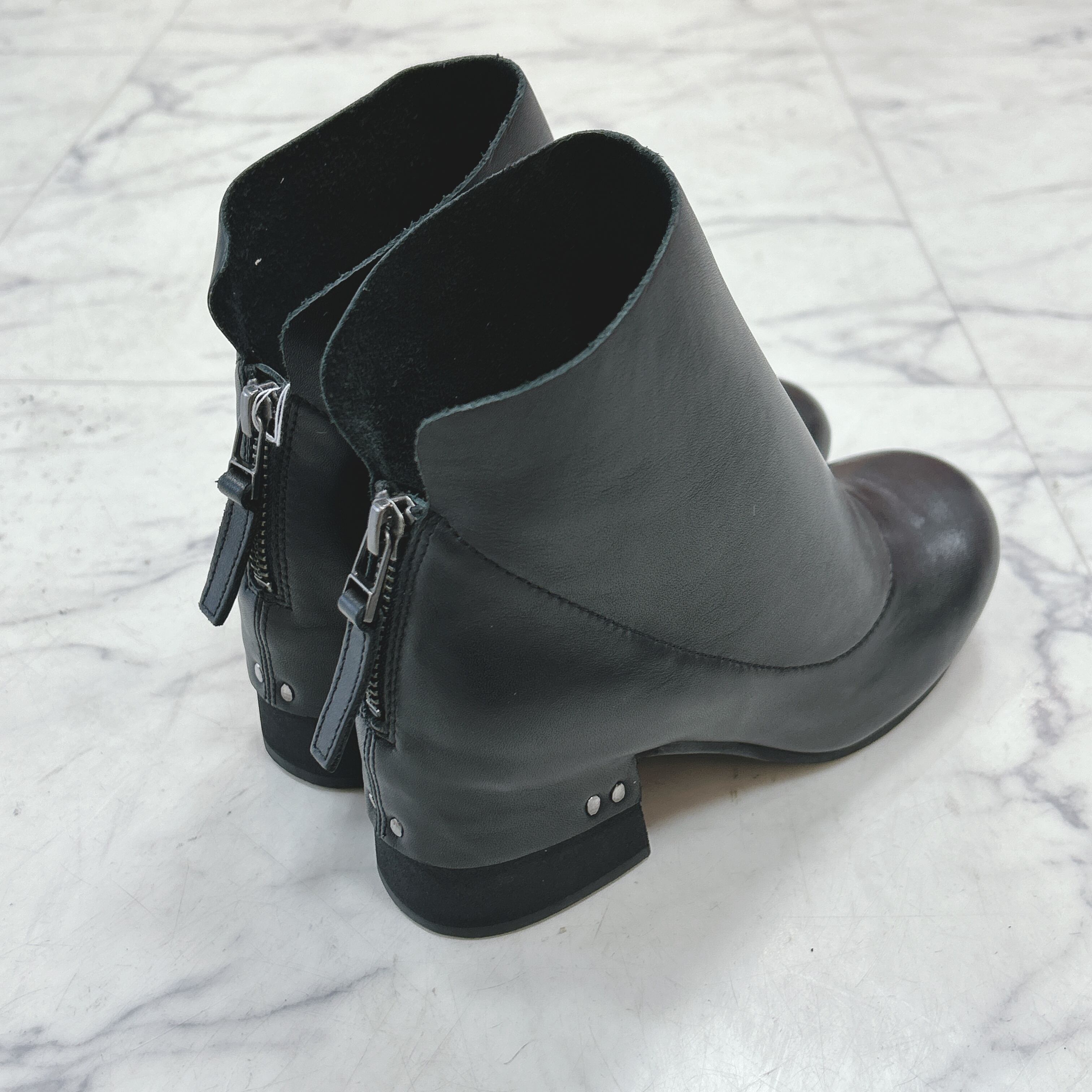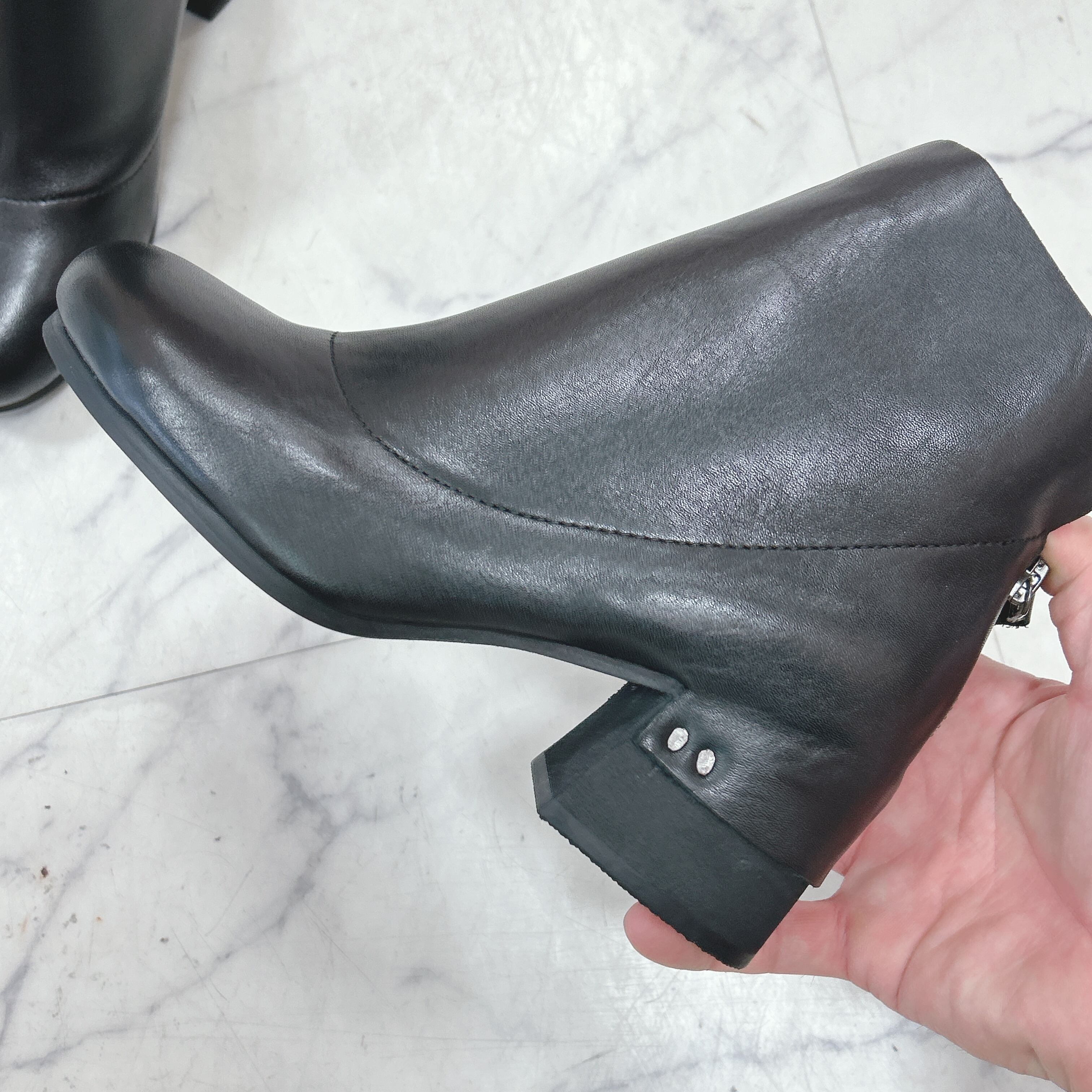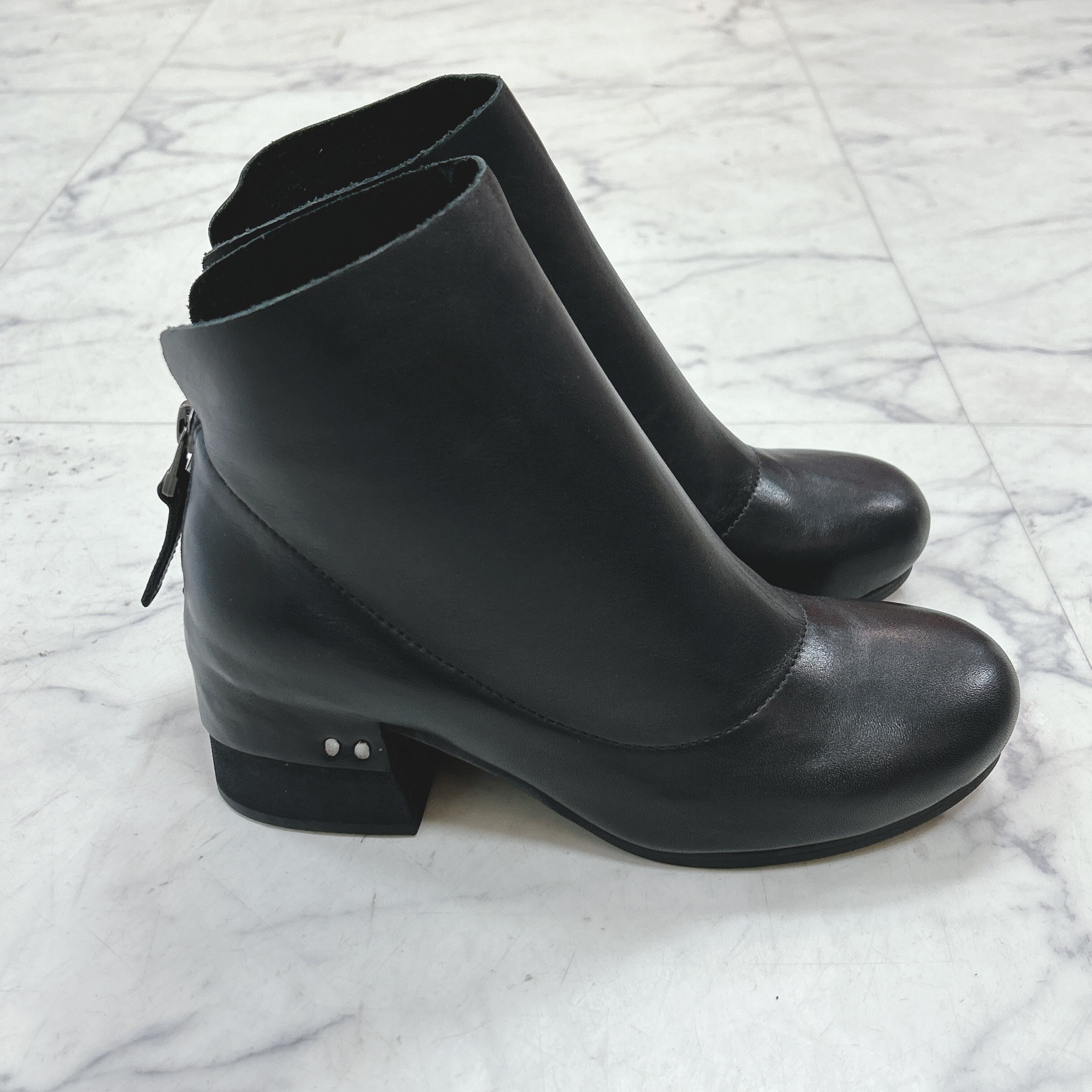 革をヒールにかぶせるのは実は職人技なのです!バックファスナーは、足首にかからない位置のため脱ぎ履きしやすいそして後ろ姿をきりっと引き締めます。