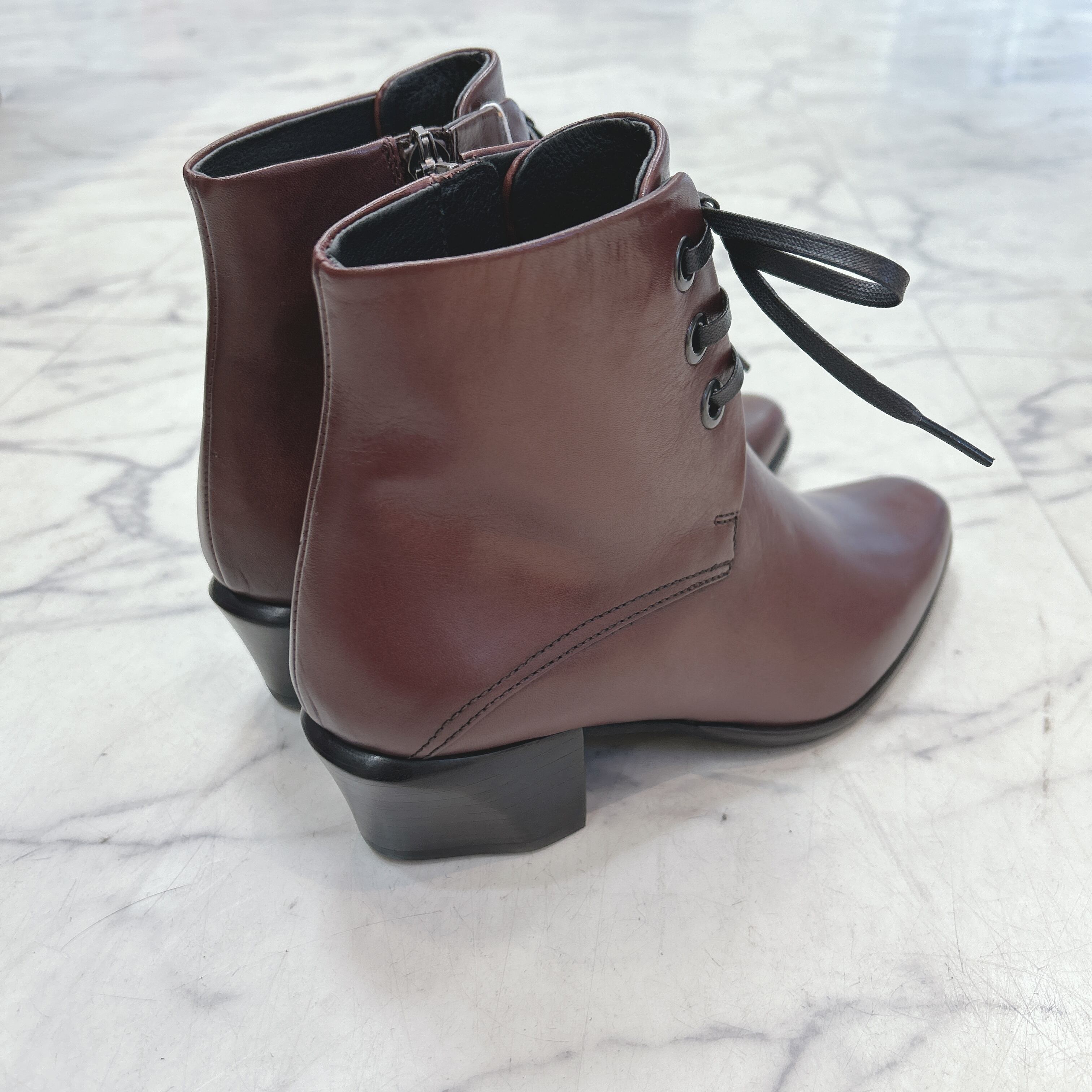 すっきりしたスクエアトゥがエレガントな履きこなしに。
