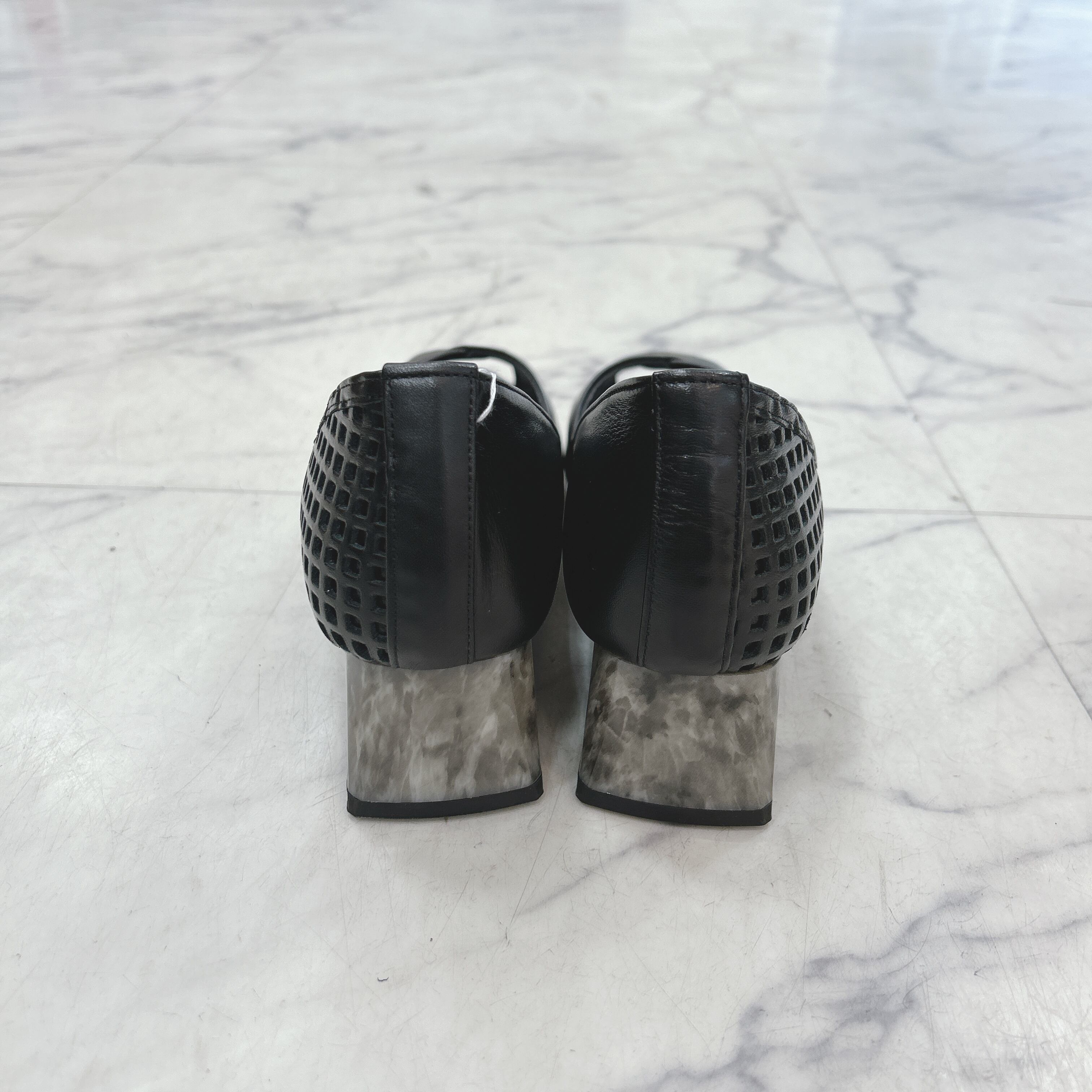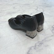 足入れにゆとりの3Eワイズ木型を使用、スクエアーにパンチング加工されたアッパーとマーブル柄のスクエアヒールが特徴です。