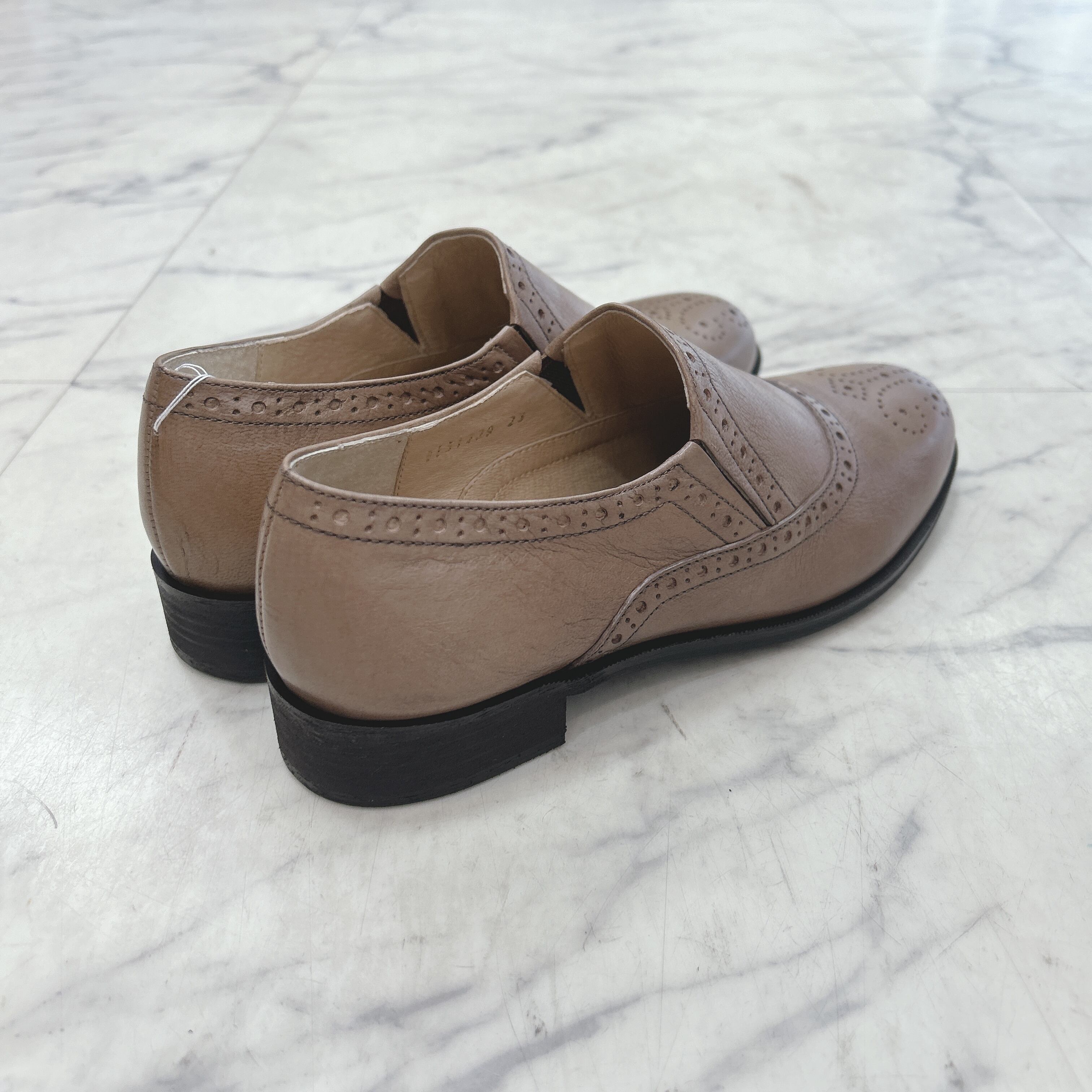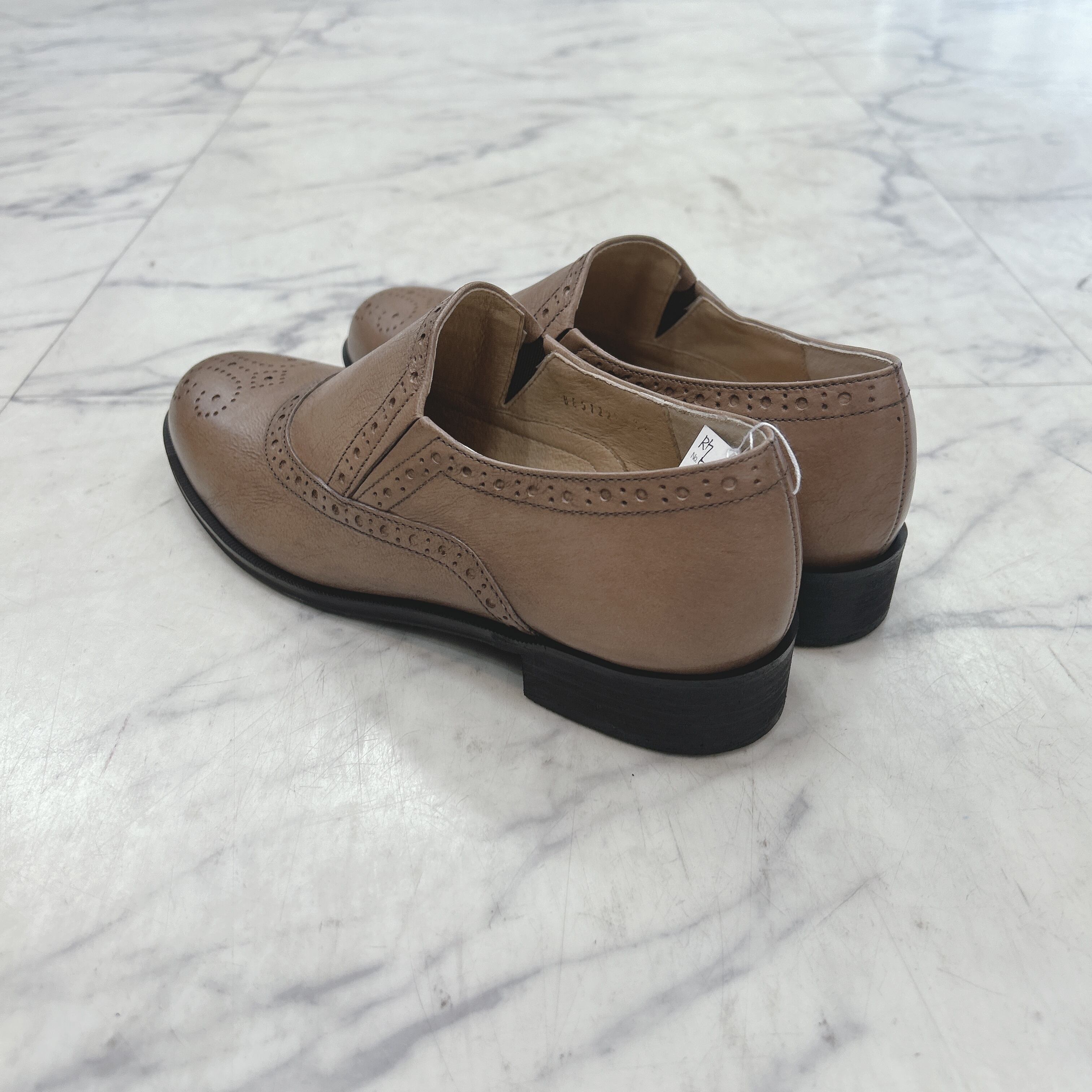 SAYA フラット本革ラウンドトウブローグスリッポン グレージュカラー